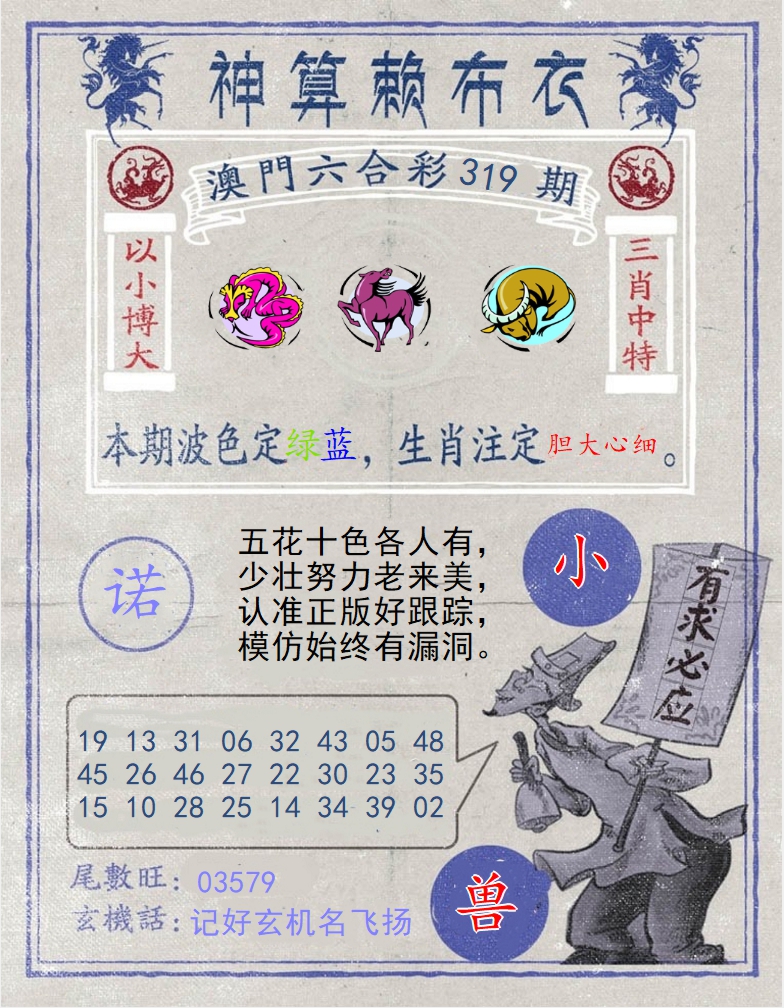 | 319期:五花十色各人有,少壮努力老来美,认准正版好跟踪,模仿始终有漏洞 |